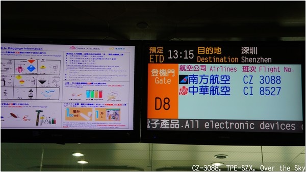 由於是去對岸,有鑑於之前的經驗,準備了許多食物過去,如泡麵、罐頭、咖啡、麥片等,甚至還有大麥若葉,也因為太多食物,使得行李又超重了。是的,每次出國到新的地方居住,行李總是超重。地勤人員給了我兩種選擇,一是直接付費託運第二件行李(RMB450元),二是依超重公斤數付費(RMB1000),想當然,直接付錢買第二件行李。為了讓大件行李的重量沒那樣重,將部分重量挪到登機箱(託運),想說挪好後再去託運。我去託運櫃檯去了三次才搞定行李托運。這時也沒啥時間逛機場免稅店(就跟在法蘭克福機場一樣,學不會教訓阿我)。